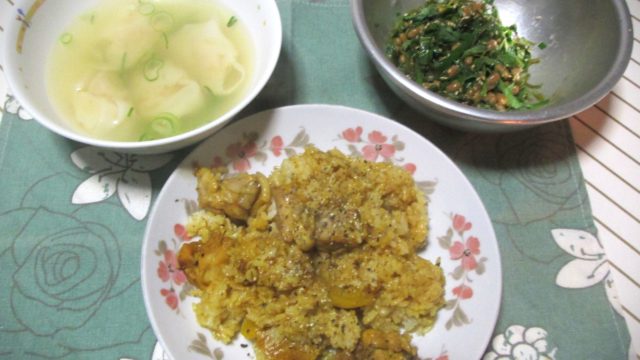 5日(木)の食卓から。左は昨日の残りで、海老ワンタンの中華風スープです。ネギを入れてます。中は鶏もも肉(245円/20%引き)とパプリカ(119円)を使ったチキンパエリア風混ぜご飯です。丸美屋製のチキンパエリア風の素(194円/30%引き)...