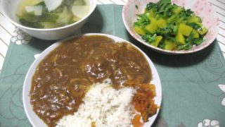 右上は昨日の残りで見切り品野菜と見切り品練り物の煮物です。