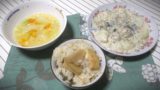 左は昨日の残りで、豆もやしとキクラゲを使った中華スープです。卵と山椒辣椒をプラスして味を変化させています。