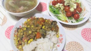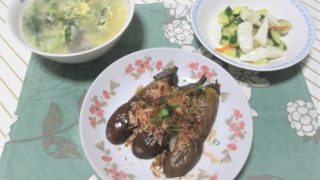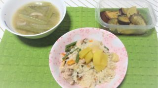 19日(月)の食卓から。左は冷凍庫に残っていたニラと卵で中華風のニラ玉汁です。中は実家で貰った冷凍食品・しょうが味のとり天です。カットレタス(91円)をつけ合わせにしてます。右は15日(木)の残りで昨日の残りでひじき炊き込みご飯。国産生ひじ...