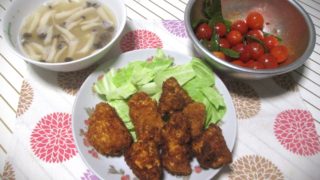 中は若鶏の明太子カツレツ(305円/20%引き)を揚げたモノです。レタス(38円)を敷いて。