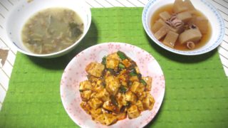 左は昨日の残りで、豆と小松菜の味噌汁です。