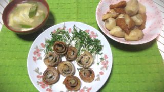 自作メニュー 2月28日(金)の食卓から Greenspoon28日(金)の食卓から。左は昨日の残りで、ネギと油揚げの味噌汁です。中はワンパンメニューで豚肉の大葉巻き(274円/20%引き)です。ブロッコリースプラウト(98円)を敷いてます。右は見切り品里芋(60円)と実家で貰った... 2025.03.01 自作メニュー