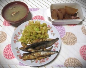 6月9日(月)の食卓から 自作メニュー6/9(Mon) X Facebook はてブ LINE Pinterest コピー 2025.06.10 9日(月)の食卓から。 6/9(Mon) 左は見切り品あさり(199円/半額)の味噌汁です。 中はお惣菜小魚のからあげ(156円/20%引き)です。見切り品セロリ(70円)を味噌田楽の素で和えてつけ合わせに。 右は昨日の残りで、大根といかのゲソの煮物です。 本日のかかった食材費は425円でございました。 *全て税抜きで8%の消費税がこれ以外にかかっております。