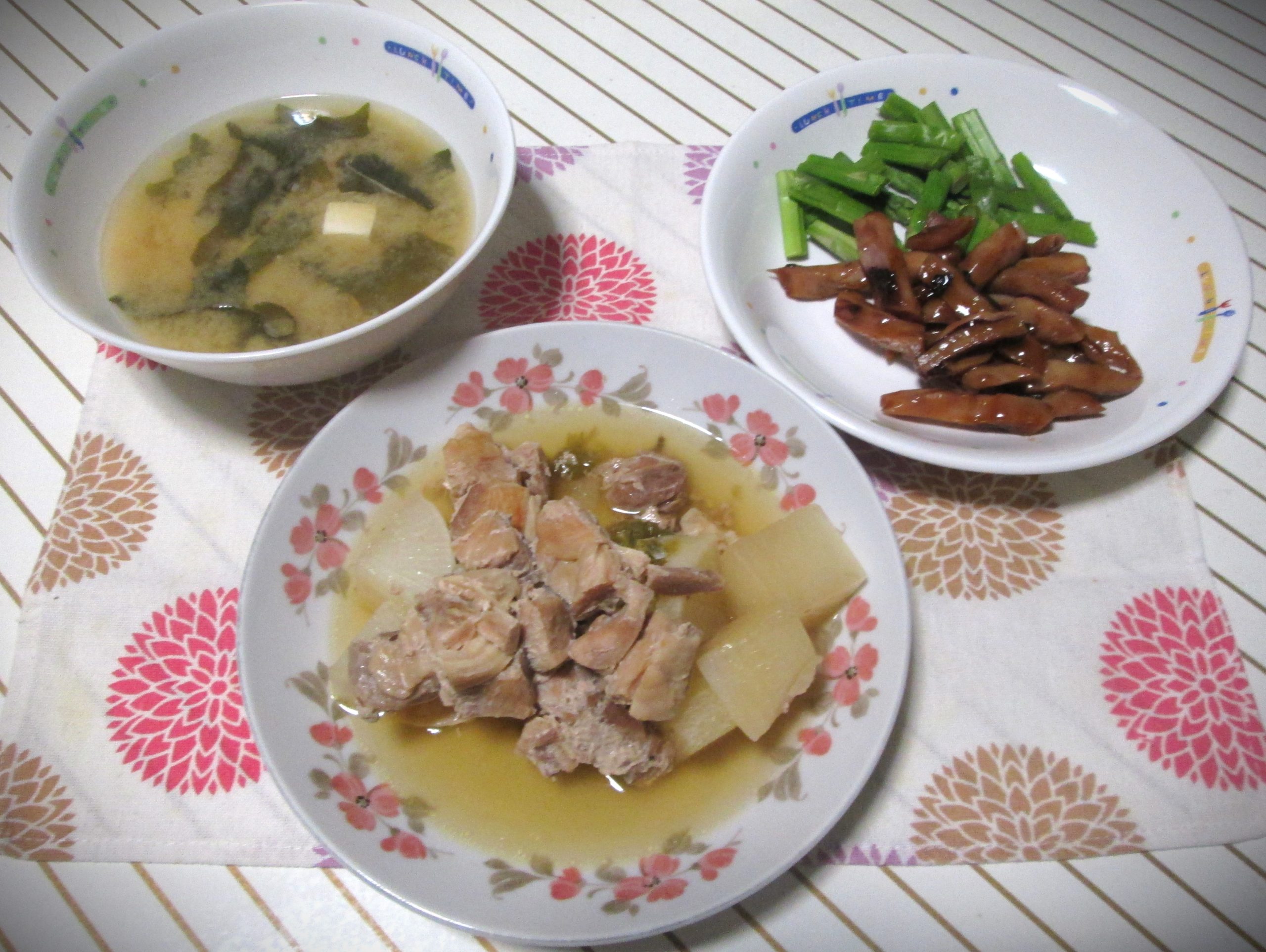 中は実家で貰った冷凍鶏もも肉と大根1/2(128円)見切り品ししとう(40円)を使った鶏大根です。麺つゆで味付けし、電気圧力釜を久しぶりに使いました。