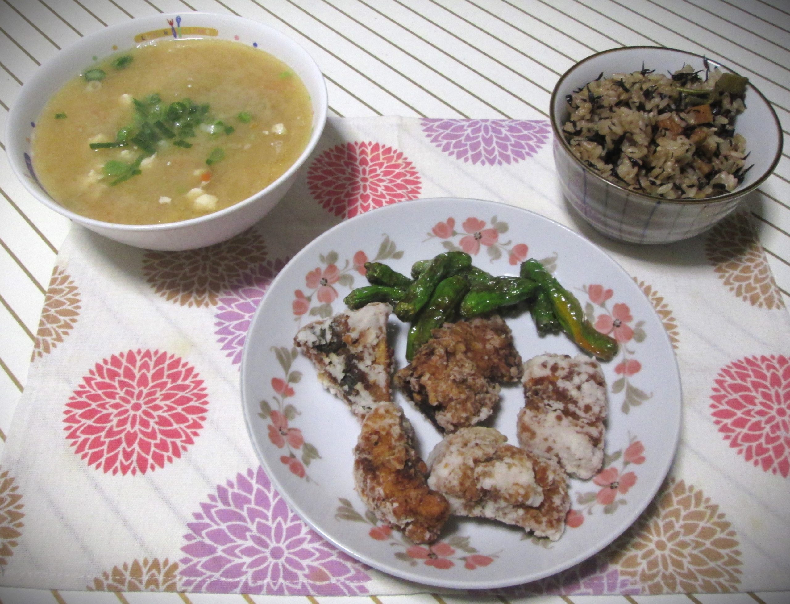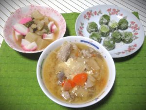 左は6日(水)の残りで、麺つゆを使った鶏大根です。それに少し寂しいので蒲鉾(118円)を加えてみました。電気圧力釜を使い、手抜きです(笑)。