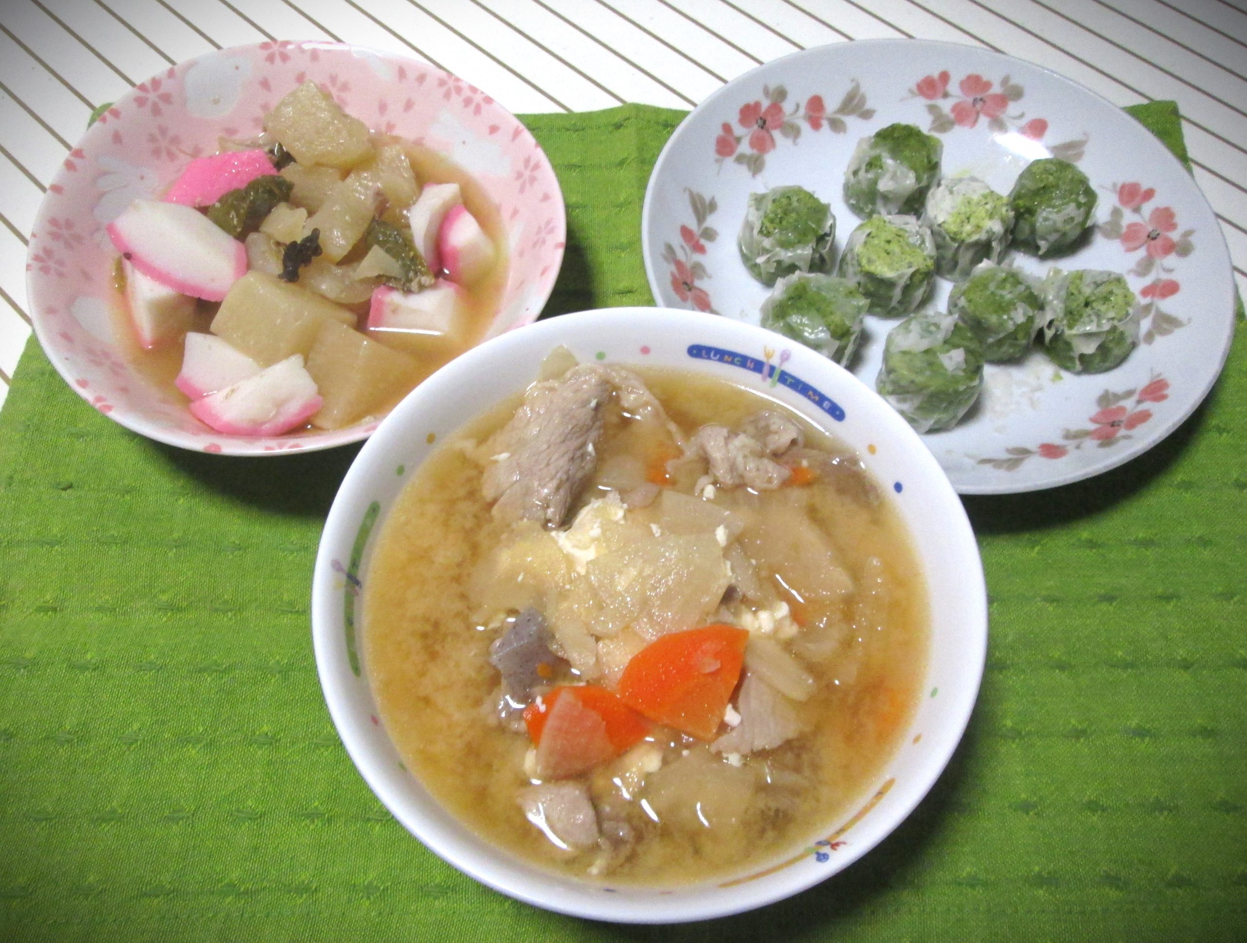 中は豚汁です。見切り品豚小間肉(213円/20%引き)豚汁用野菜水煮(298円)豆腐(98円)を具材として使ってます。