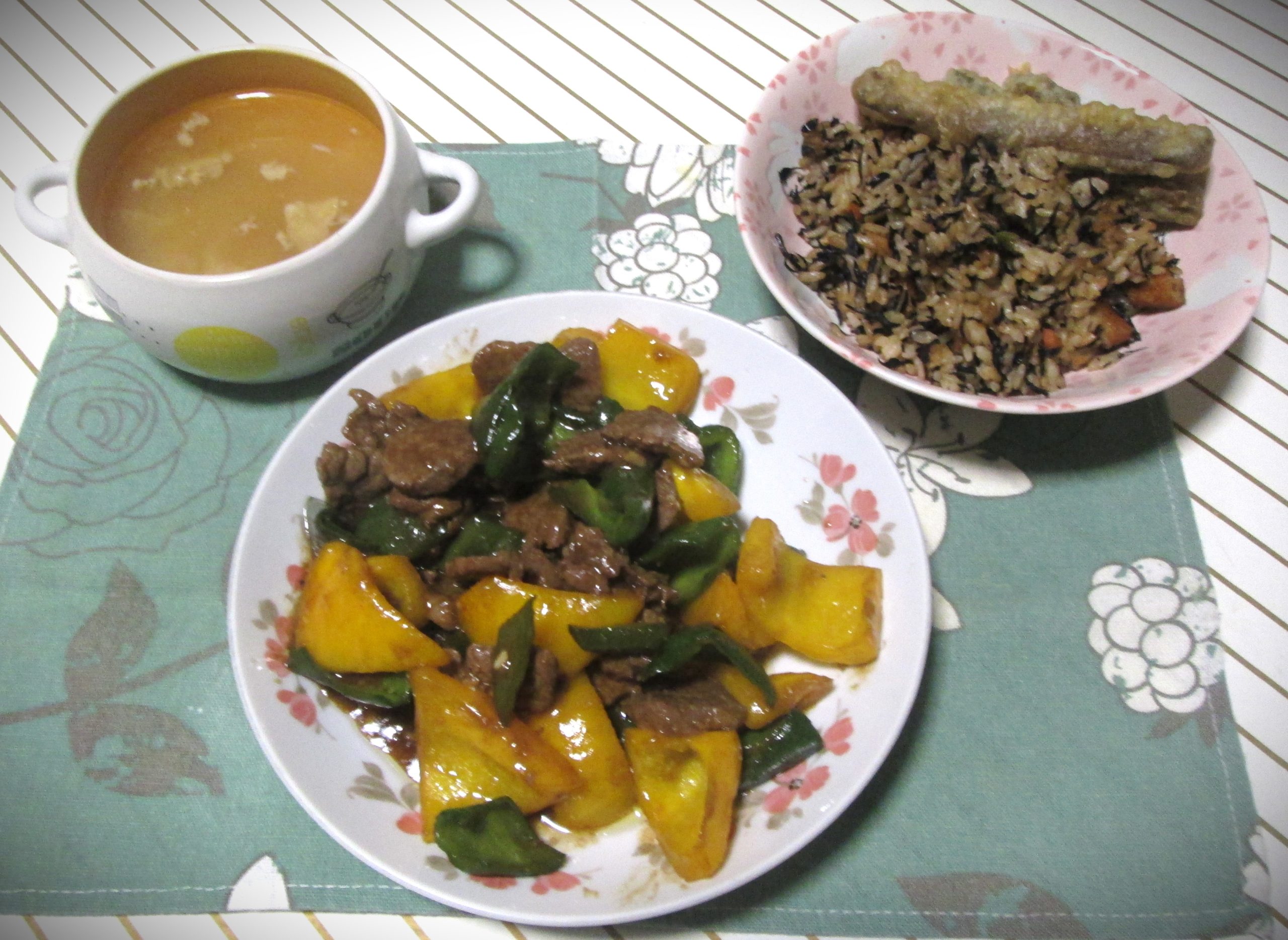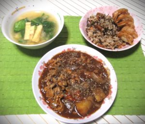 右は9日(土)の残りで、ひじきの炊き込みご飯です。にんじん・丸天・おくらが入ってます。見切り品の揚げぎょうざ(74円/半額)をプラス。