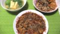 右は昨日の残りで、ポークシチューです。豚肉・玉ねぎ・じゃがいも。にんじんが具材です。ハウス社製のシチューの素を使い、ローリエやニンニクもプラス。最後に乾燥バジルを仕上げに。