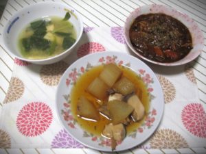 左は昨日の残りで、小松菜と油揚げの味噌汁です。