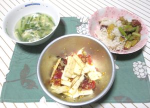 右は昨日の残りで、さつま芋ご飯です。見切り品アスパラガス(150円)の梅和えを添えて。