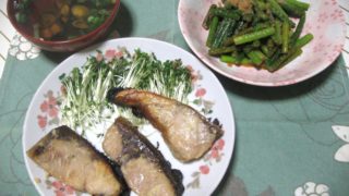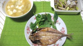 パーソナルスムージーならGREEN SPOON!20日(水)の食卓から。左は残っていた豆腐と冷凍庫にあったカットキャベツを使った味噌汁です。中は見切り品アジの開きの干物2匹(199円/半額)のうち1匹を焼いたモノです。見切り品ベビーリーフ(...
