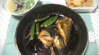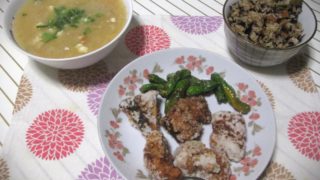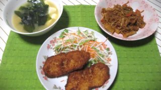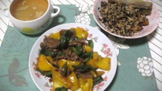 10日(日)の食卓から。左は8日(金)の残りで、豚汁です。豚肉・豚汁用野菜水煮・豆腐が具材です。中は見切り品焼肉用の牛肉(280円/半額)と見切り品パプリカ(149円/半額)冷凍庫に残っていたピーマンを使ったオイスターソース炒めです。ニンニ...