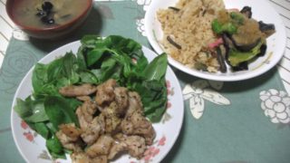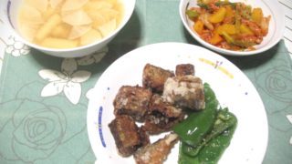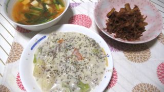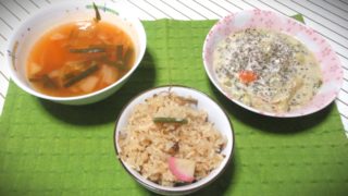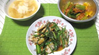 29日(月)の食卓から。左は昨日の残りで、小松菜と豆腐の味噌汁です。あなたの「得意」や「当たり前」が活かせる!主婦・夫やWワーカーにおすすめ【タスカジ】中はおくら(100円)と木綿厚揚げ(98円)の味噌炒めです。右は冷凍庫に残っていたもやし...
