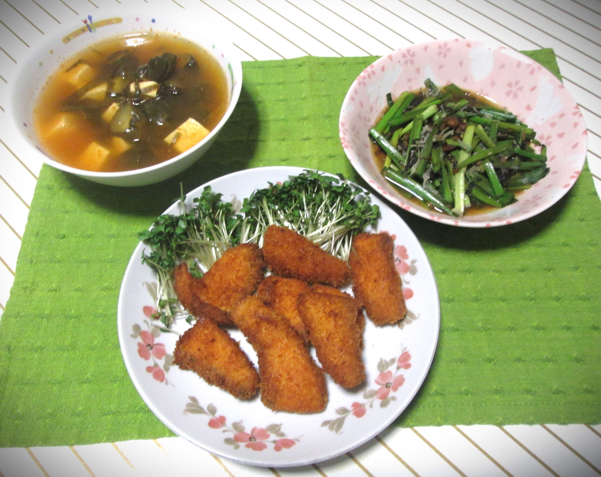 左は昨日の残りで、きゅうりのキムチと木綿豆腐の韓国風スープです。鶏ガラスープの素・しょうゆで味付けしてます。