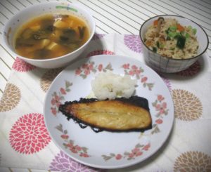 中は見切り品サバの西京漬け(398円/20%引き)を焼いたモノです。少し焦げました(^^;。大根1/4(108円)おろしをつけてます。西京漬けのサバはもう1つ半身を残して冷凍庫へ。