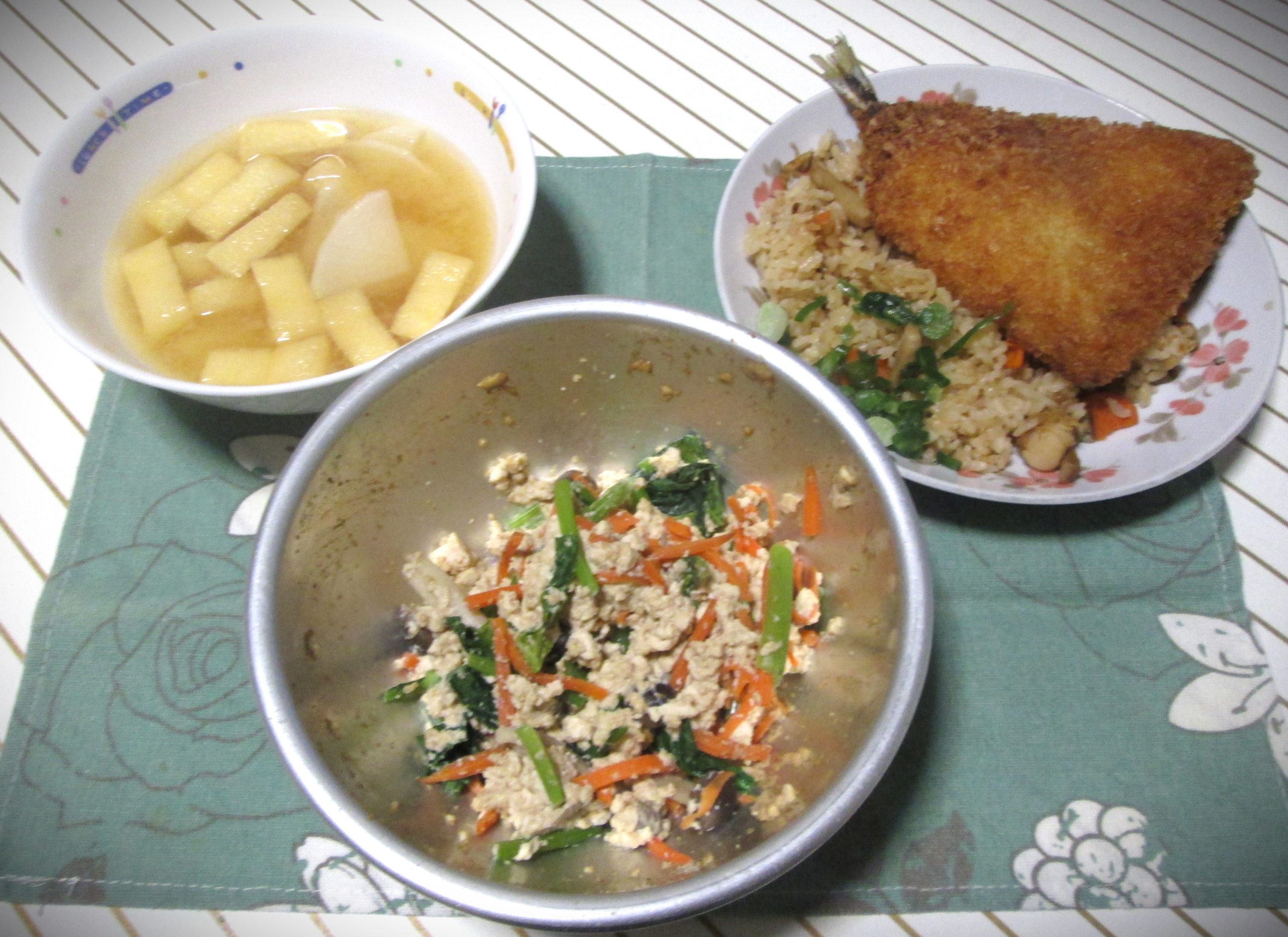 右は昨日の残りで、ベビー帆立貝・にんじん・ぶなしめじを使った炊き込みご飯です。麺つゆと酒で味付けです。大きなアジフライ(200円/20%引き)をプラス。