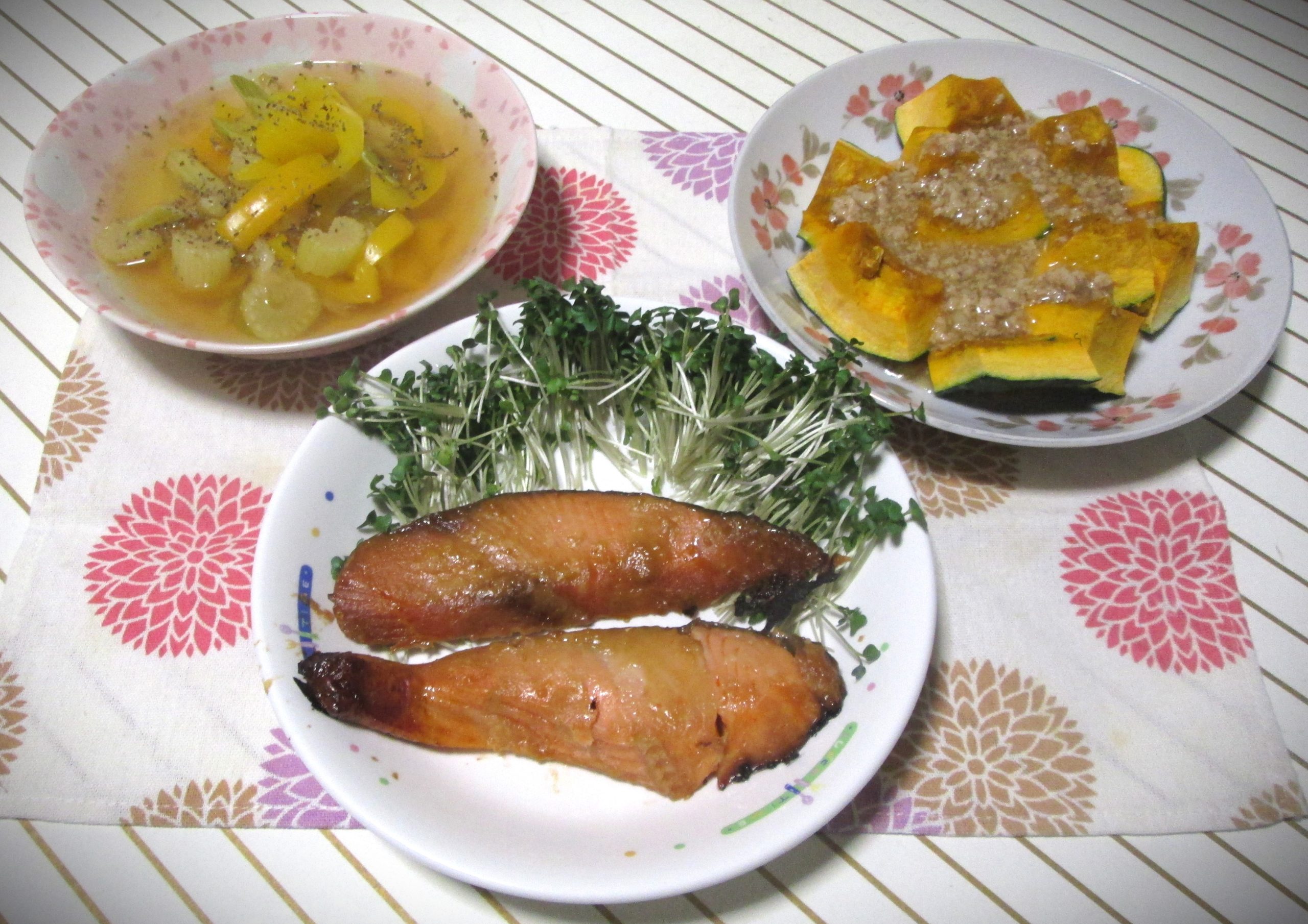 左は冷凍庫に残っていたセロリと見切り品パプリカ(54円/半額)を使ったコンソメスープです。乾燥パセリをふりかけて。