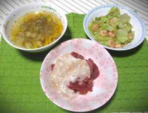 9月19日(金)の食卓から 自作メニュー9/19(Fri) X Facebook はてブ LINE Pinterest コピー 2025.09.20 19日(金)の食卓から。 9/19(Fri) 左は昨日の残りで、セロリとパプリカのコンソメスープです。乾燥パセリをふりかけて。 タスカジ 中は見切り品マグロの切り落とし(263円/20%引き)と見切り品長芋(100円)を使った山かけです。ポン酢で頂きます。 右は見切り品サラダえび(214円/半額)と見切り品キャベツ1/4(46円/20%引き)を使ったオイスターソース炒めです。 タスカジ 本日のかかった食材費は623円でございました。 *全て税抜きで8%の消費税がこれ以外にかかっております。
