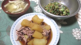 左は冷凍庫に残っていた大根と油揚げを使った味噌汁です。