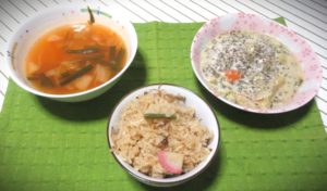 左は昨日の残りで、キムチと豆腐とにらを使った韓国風のスープです。鶏ガラスープの素を使ってます。