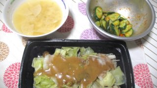 右は昨日の残りでホワイトシチューです。ゆでじゃがいも・にんじん・玉ねぎのセットブイヨン入り・牛ミンチ・ブロッコリー・牛乳を具材として使ってます。ハウス社製のクリームシチューの素をベースに、ローリエで香りづけして、乾燥パセリを散らせて。