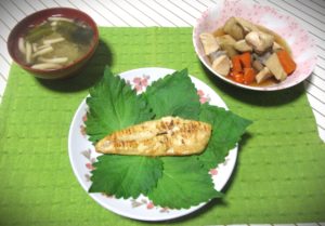 中は見切り品サバの西京漬け(249円/半額)焼きです。大葉(68円)を添えて。