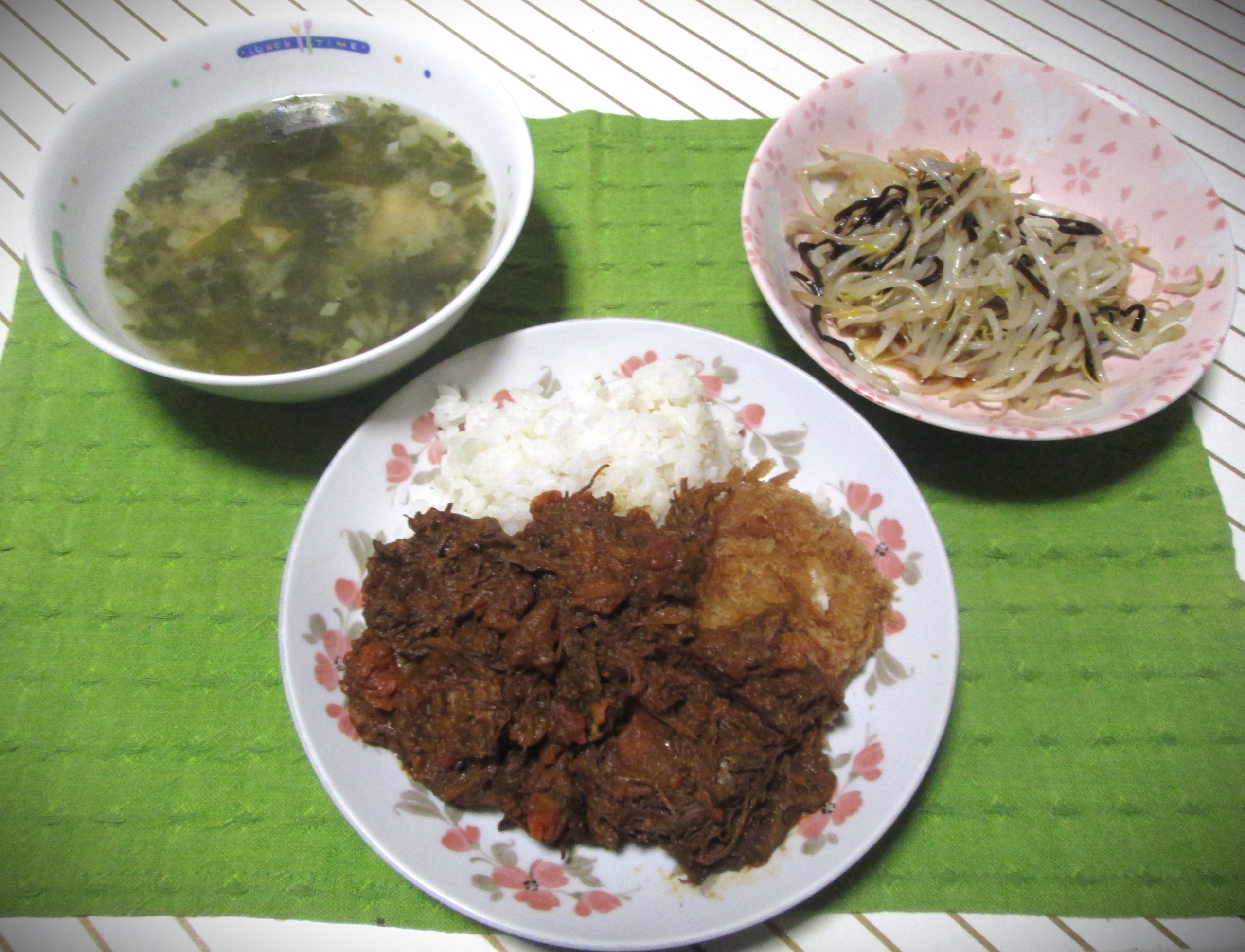左は豆腐(98円)と乾燥ワカメ・ねぎの味噌汁です。