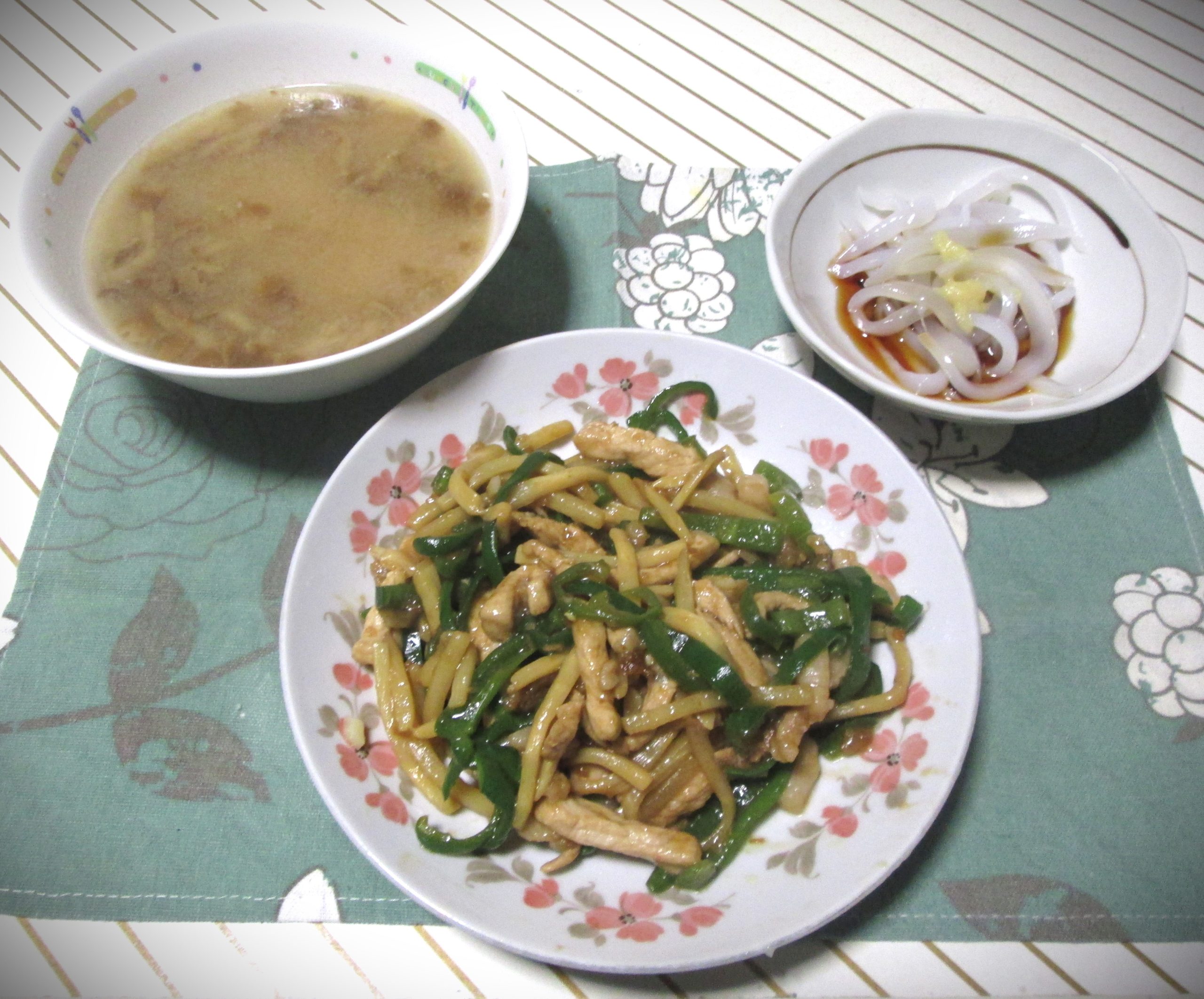 右は昨日の残りで、チンジャオロースです。ピーマン・豚肉・細切りタケノコ・クックドゥの合わせ調味料・にんにくを使ってます。