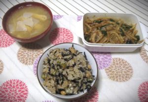 中は生ひじき(198円)の炊き込みご飯です。大豆水煮(98円)おくら(98円)が具材で、麺つゆと酒で味付けです。