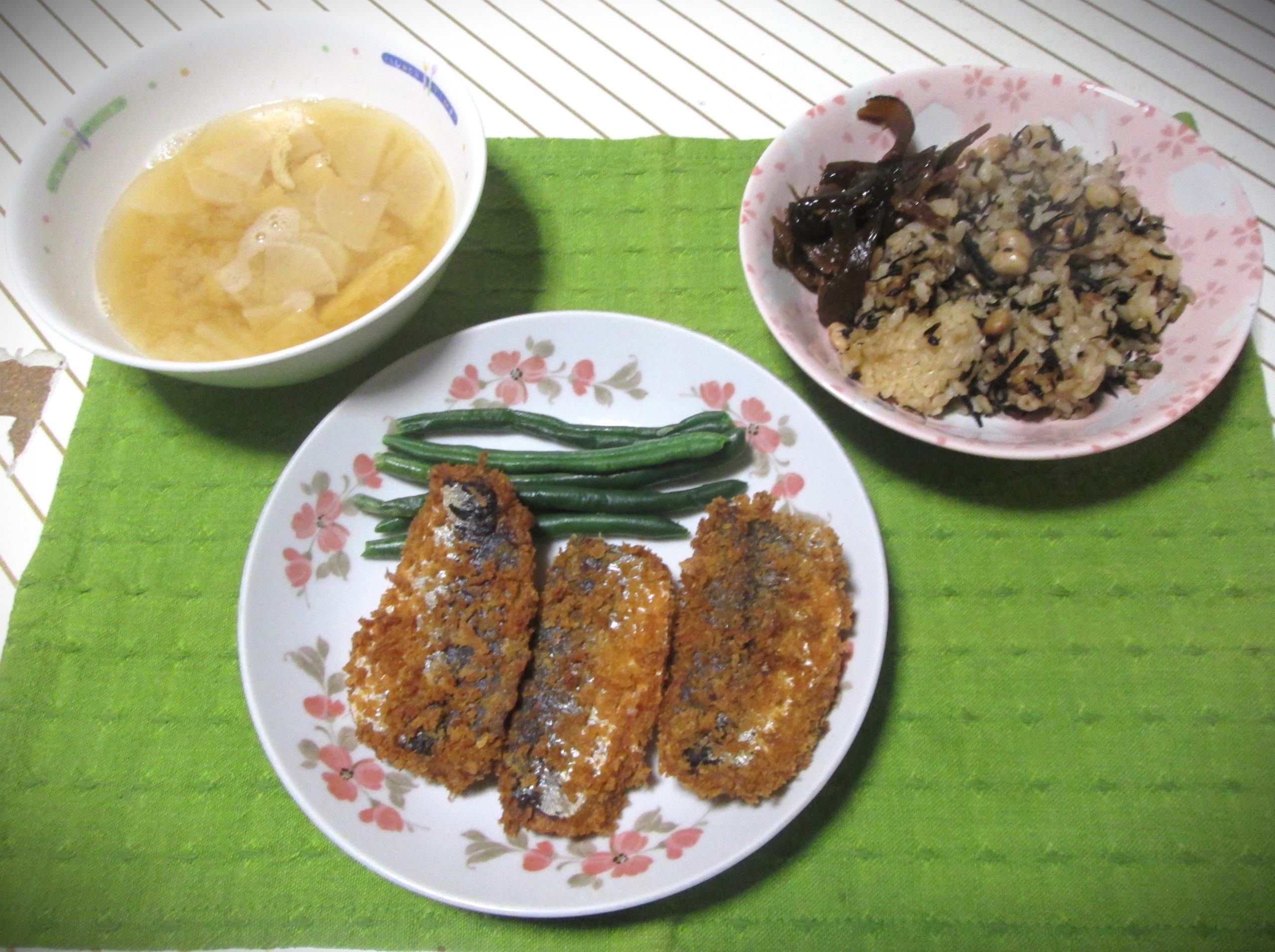 左は冷凍庫に残っていた大根と刻み揚げ(98円)の味噌汁です。