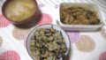 右は昨日の残りで、ひじきの炊き込みご飯です。具材は大豆水煮・おくらで、麺つゆと酒で味付けです。ワカメ煮(149円/半額)をプラス。