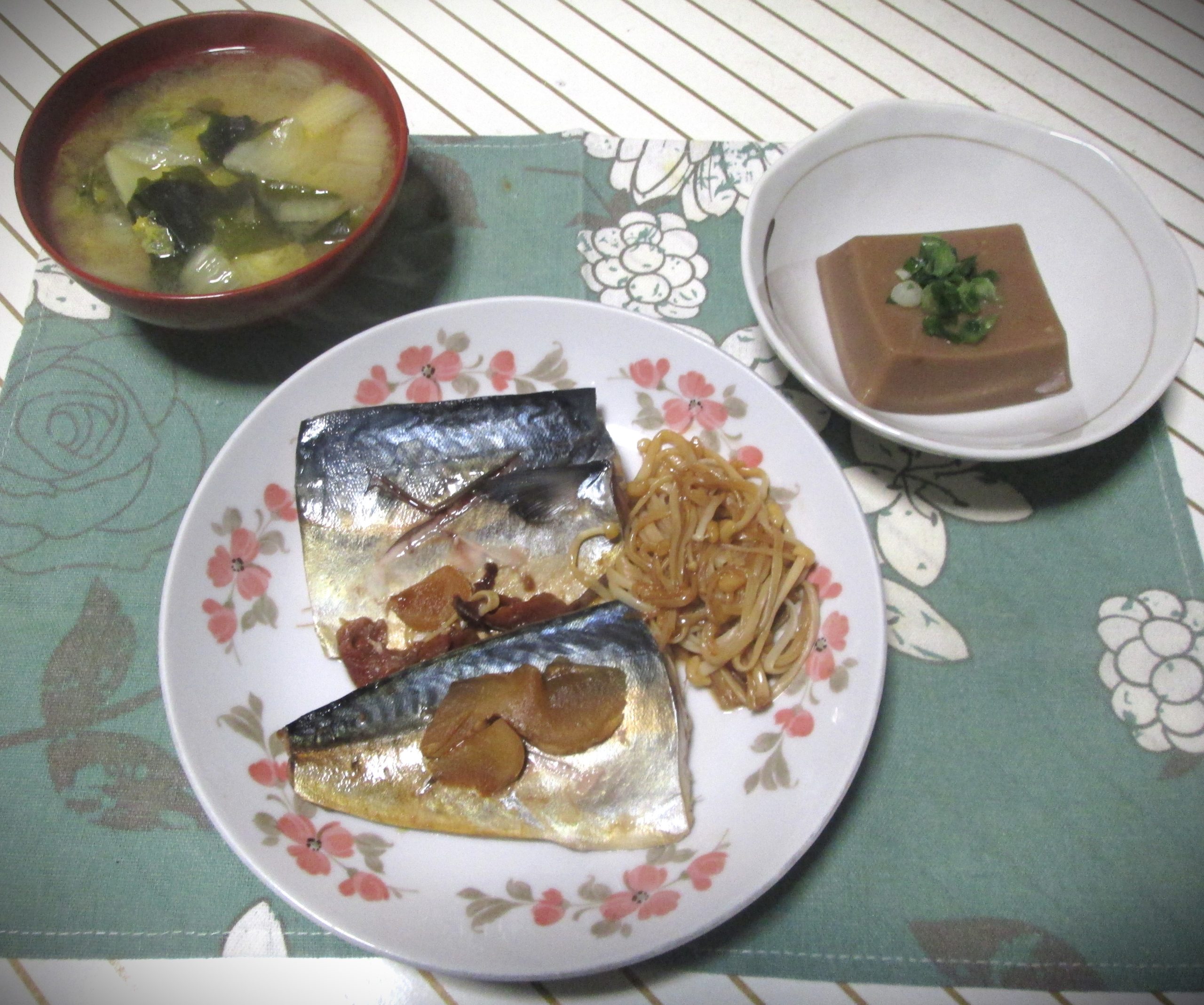 左は昨日の残りで、大根と油揚げの味噌汁です。
