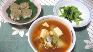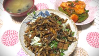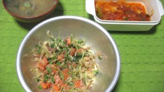 9日(日)の食卓から。左は冷凍庫に残っていた大根と油揚げ、そしてカットシメジ(98円)を使った味噌汁です。中は見切り品ガーリックカリーチキン(304円/半額)丼です。カレーソースがすでに鶏もも肉に絡めてあったもので、電子レンジで温めてそのま...