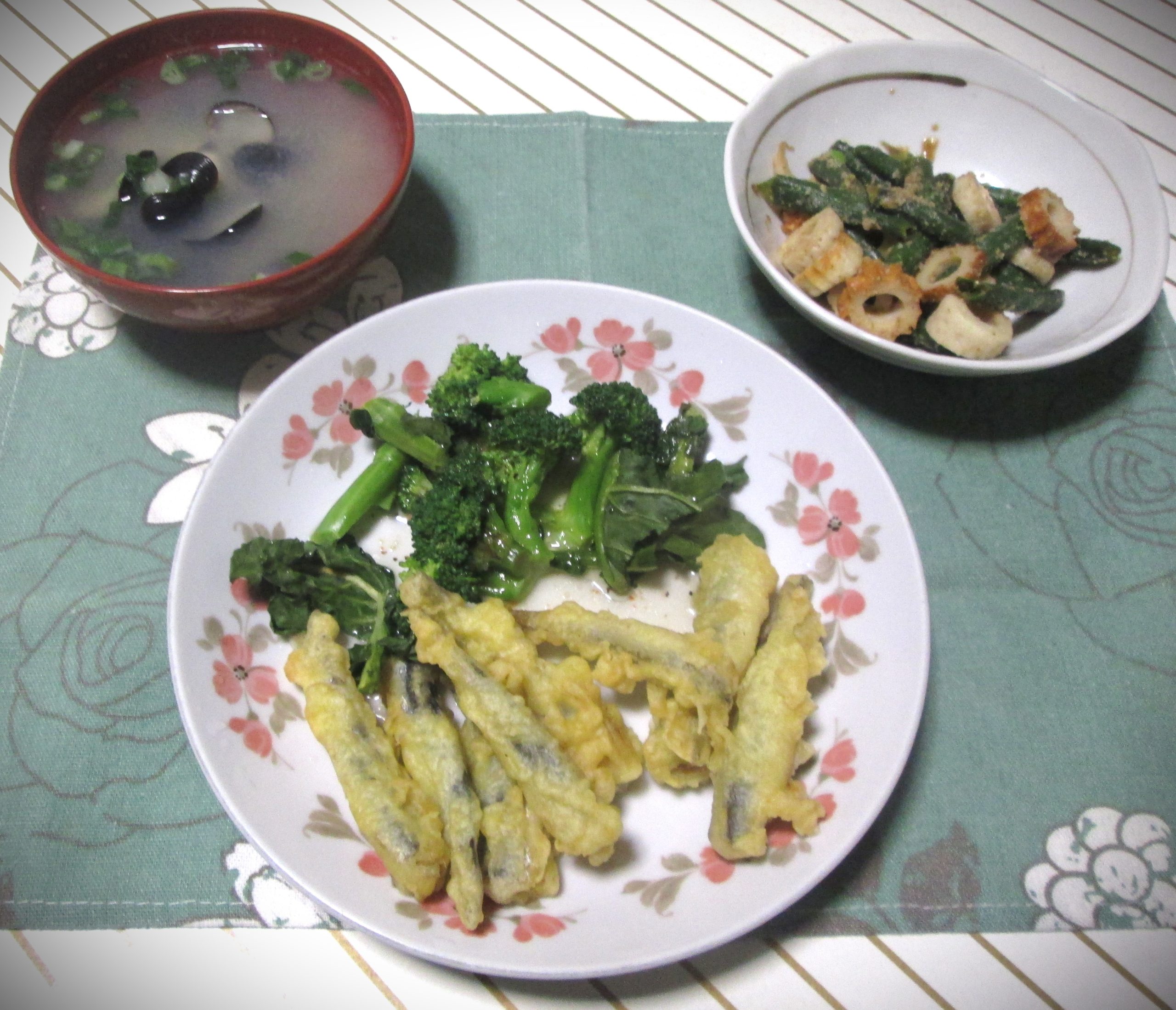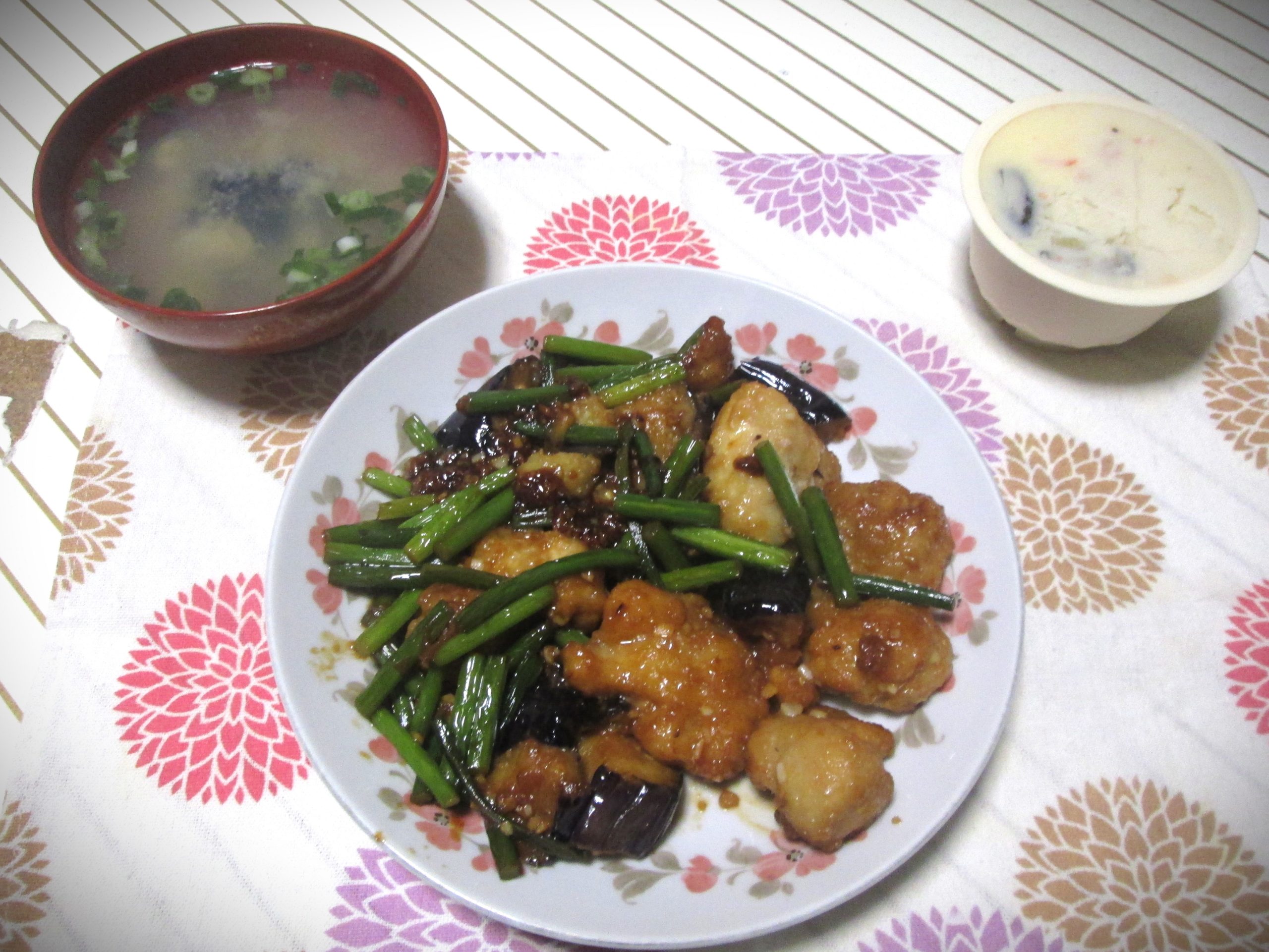 中は実家で貰った冷凍食品「柑橘ポン酢で仕上げる鶏もも肉とナスのさっぱり揚げ」を使った炒め物です。にんにくの芽(98円)をプラスして、にんにくもたっぷり入ってます。