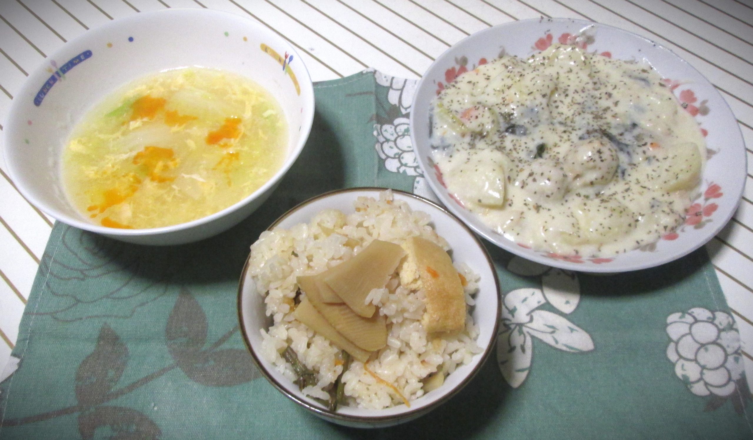 右は昨日の残りで、帆立貝のつみれのホワイトシチューです。他の具材はチンゲン菜・にんじん・ジャガイモです。牛乳とS&B社製ホワイトシチューの素を使い、にんにく・ローリエの葉も入れてます。ブラックペッパーを仕上げにふりかけてます。