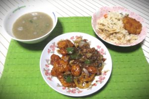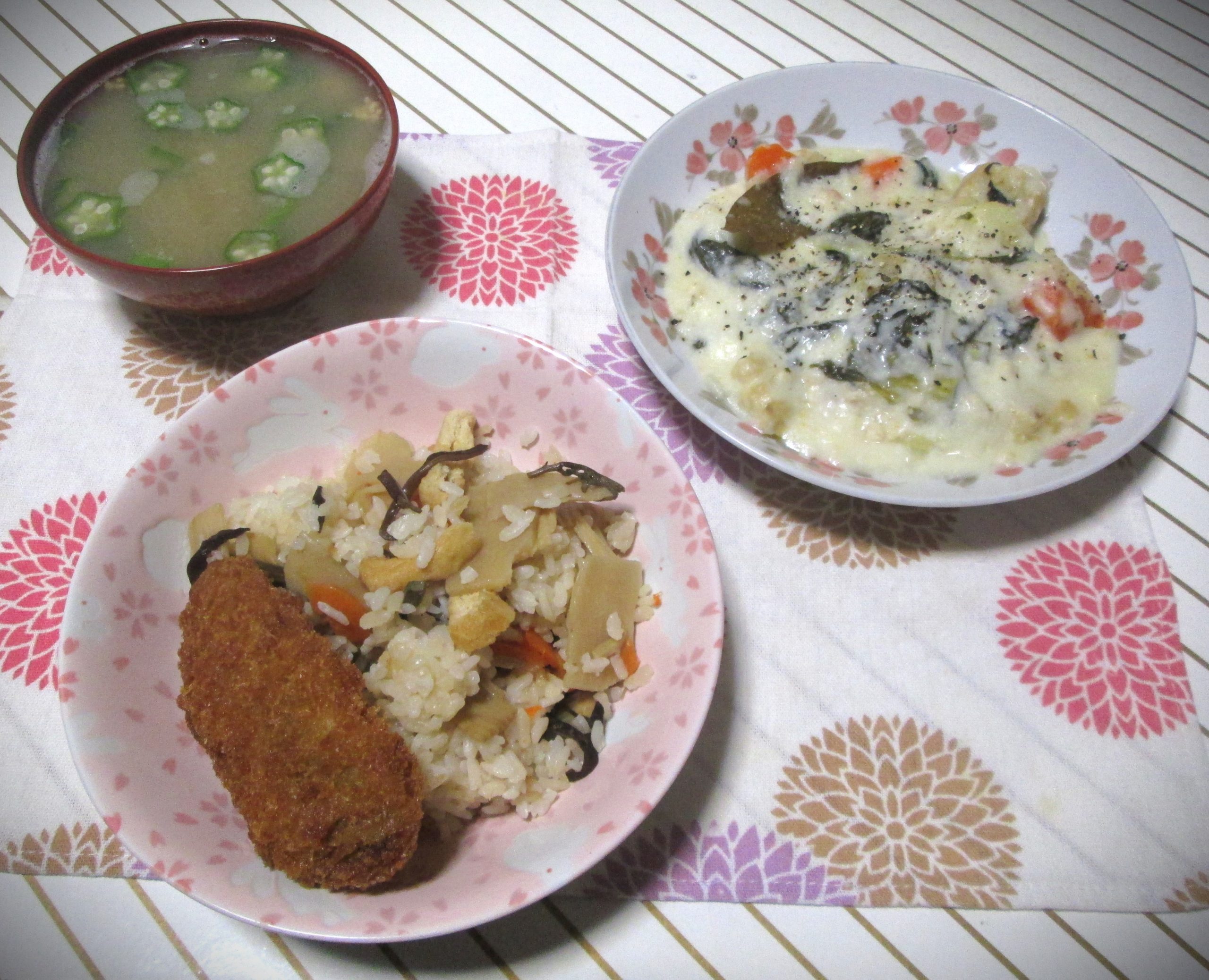右は6日(土)の残りで、山菜炊き込みご飯です。にんじんと刻み揚げが具材です。見切り品カニクリームコロッケ(160円/20%引き)を添えて。