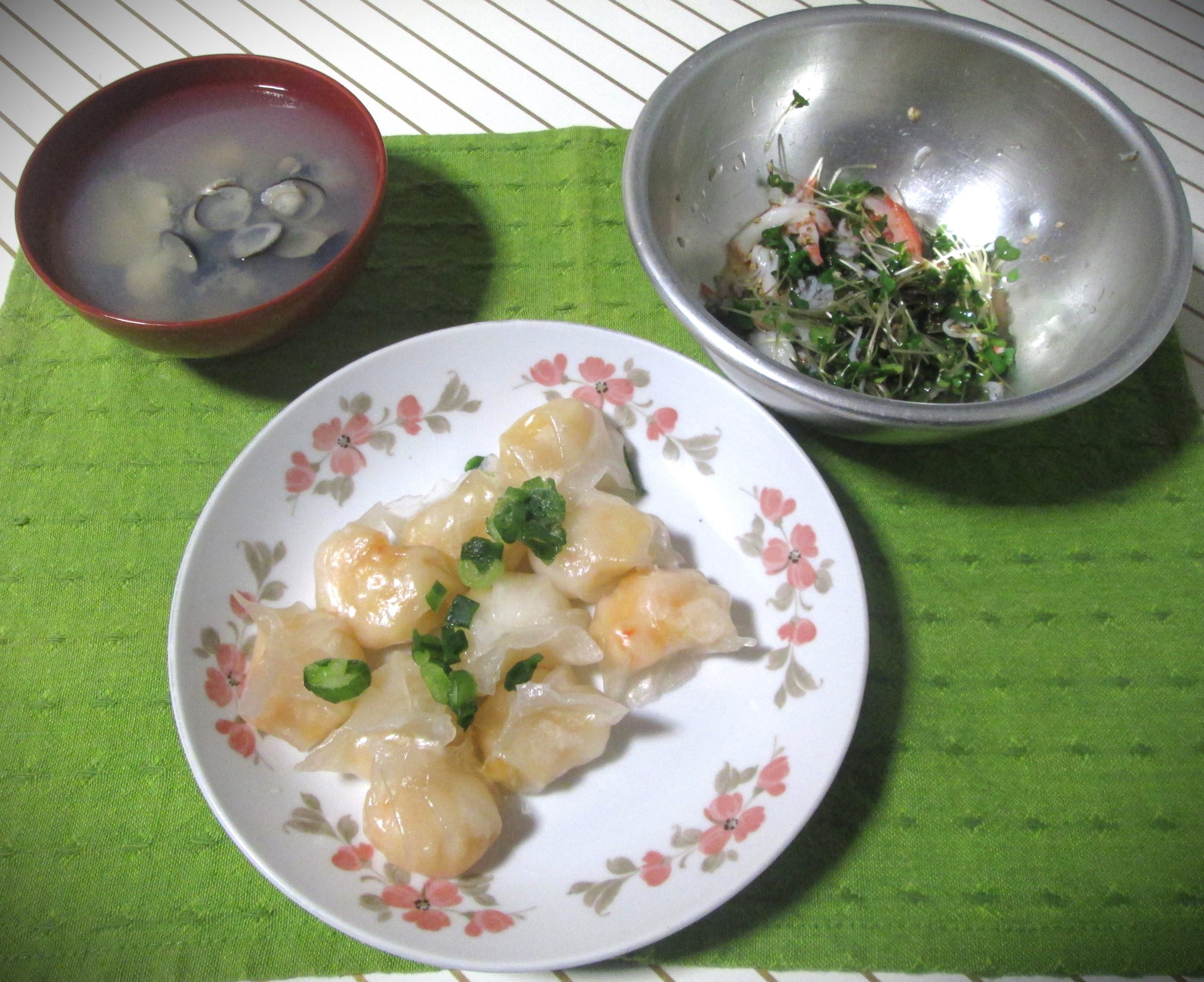 右は冷凍庫に残っていたもずく酢です。ブロッコリースプラウト(98円)カニかまぼこ(158円)冷凍庫に残っていたしらす・ゴマを使ってます。