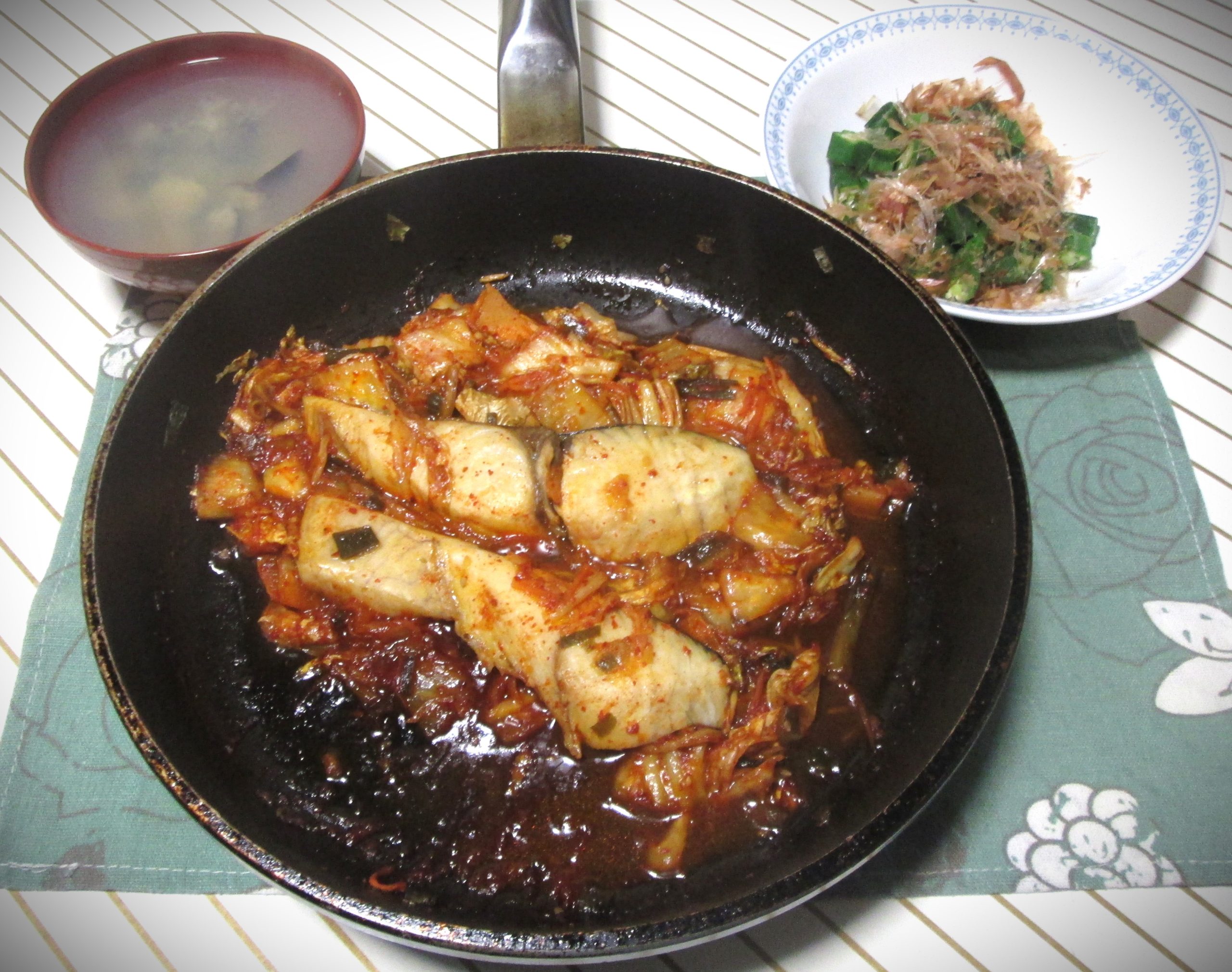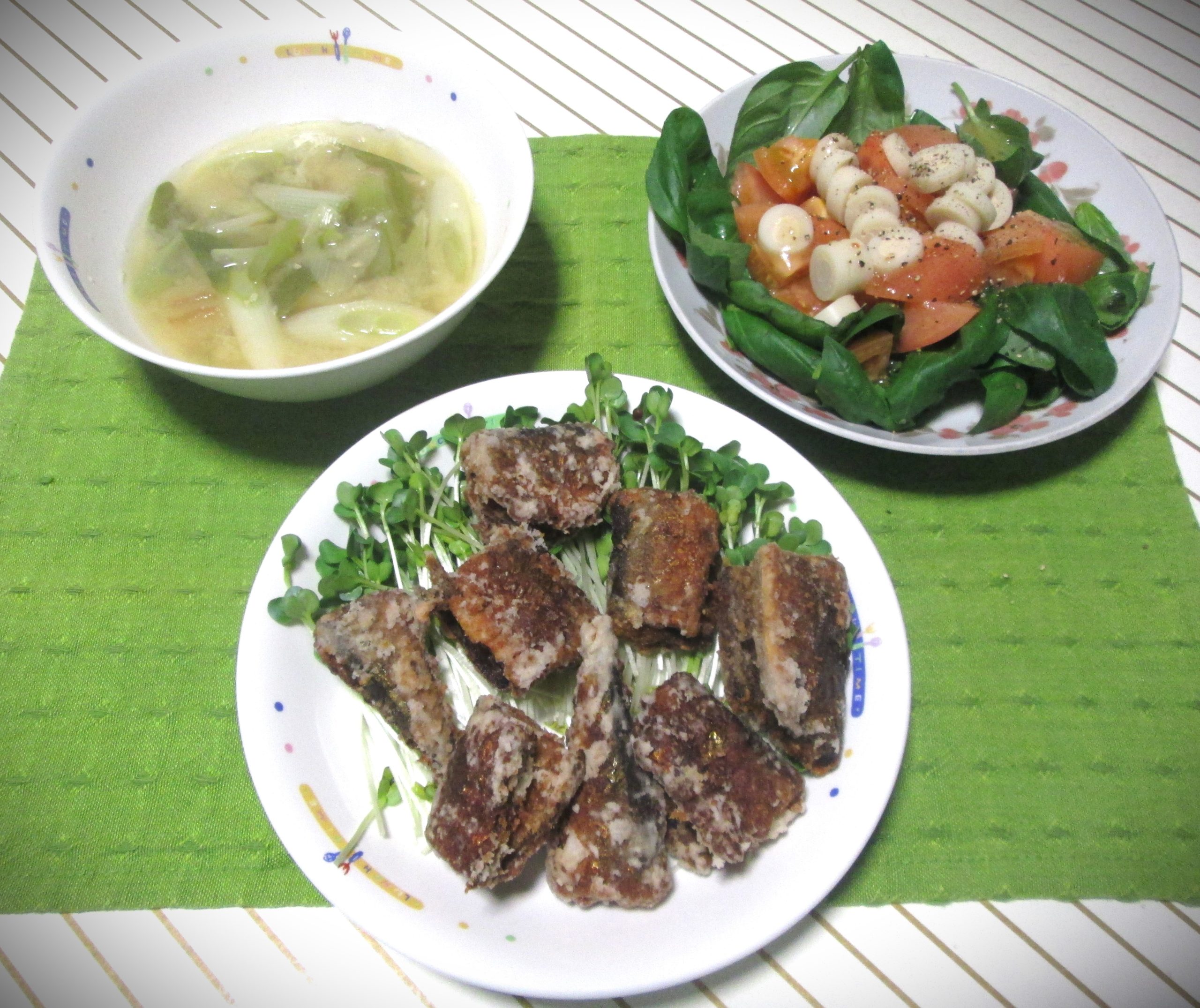 左は見切り品白ネギ(120円)と残っていた麩の味噌汁です。