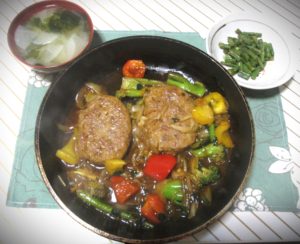 中は煮込みハンバーグです。整形された牛豚合挽ミンチのハンバーグ(398円)の両面に焼き目をつけて、11月25日(火)に使って冷凍保存していたモランボン製の煮込みハンバーグソースの素で煮込み、残っていた玉ねぎ・パプリカ・ブロッコリーを加えてます。