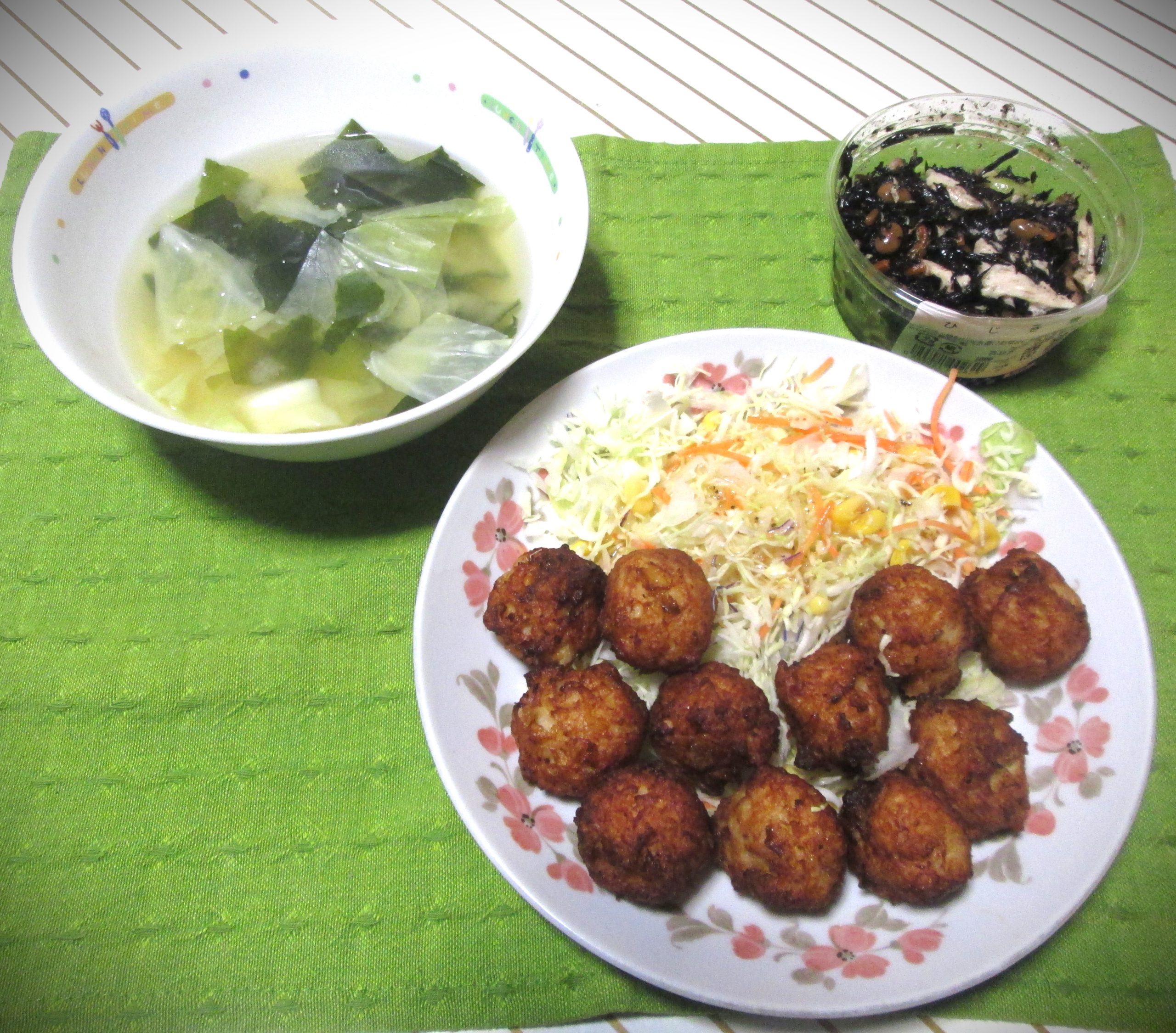 中は残っていた鶏むね肉150gを使った一口チキンカツです。見切り品キャベツ(62円/20%引き)を添えてポン酢で頂きます。