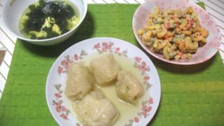中は残っていた鶏むね肉150gを使った一口チキンカツです。見切り品キャベツ(62円/20%引き)を添えてポン酢で頂きます。
