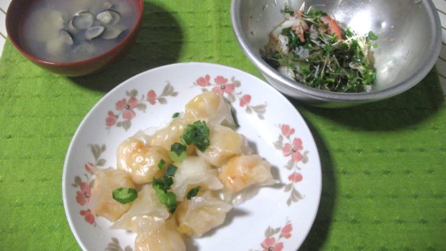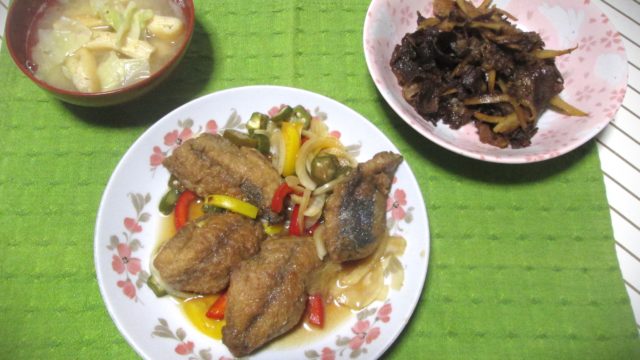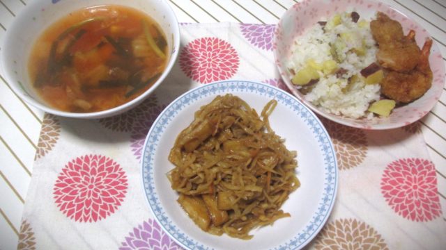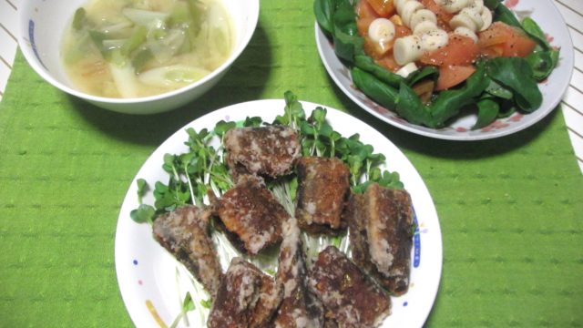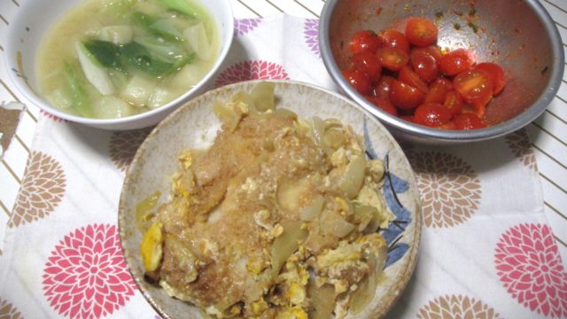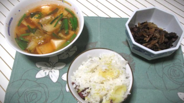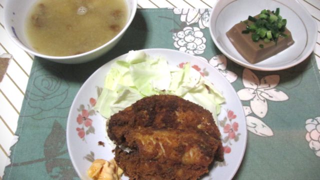 21日(日)の食卓から。左は1/3大根(78円)とワカメの味噌汁です。中は煮込みハンバーグです。整形された牛豚合挽ミンチのハンバーグ(398円)の両面に焼き目をつけて、11月25日(火)に使って冷凍保存していたモランボン製の煮込みハンバーグ...