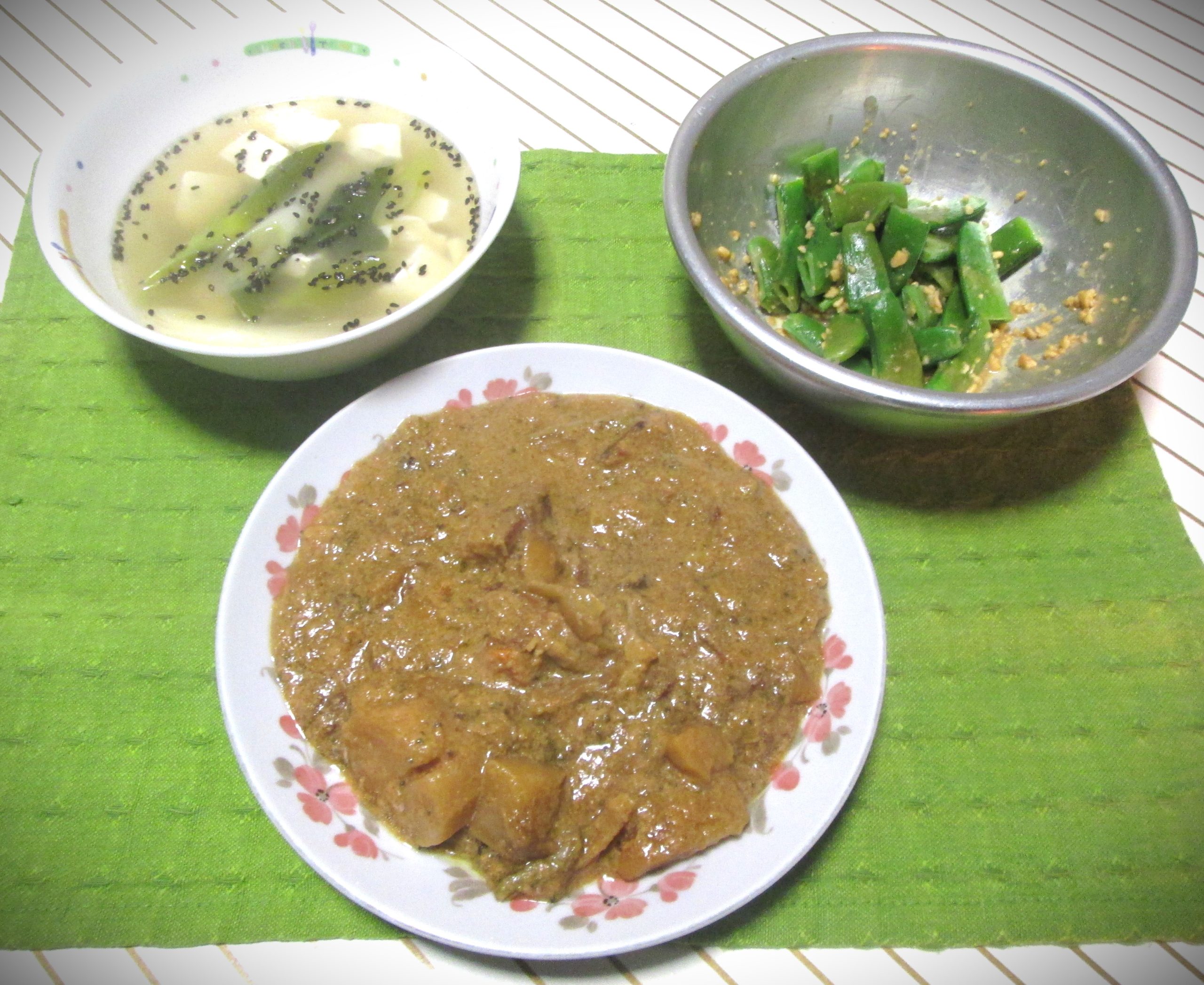 左は冷凍庫にのこっていたおくらとなめこ(95円)刻み揚げを使ったヌルヌル(^^;味噌汁です。