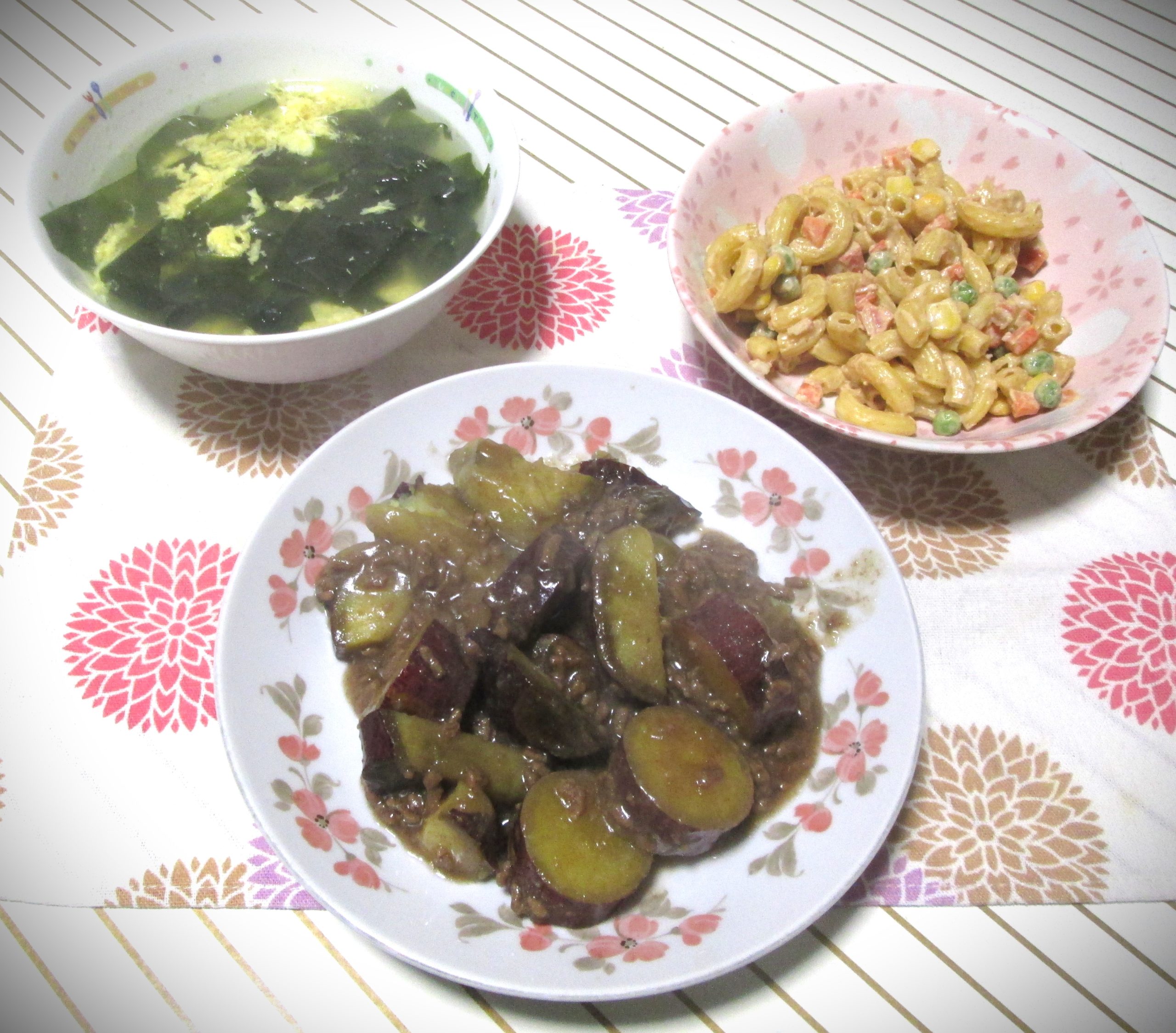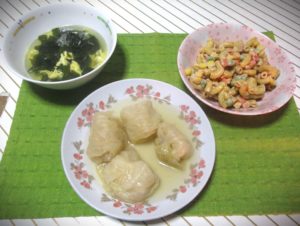 左は昨日の残りで、ワカメと卵の中華風スープです。