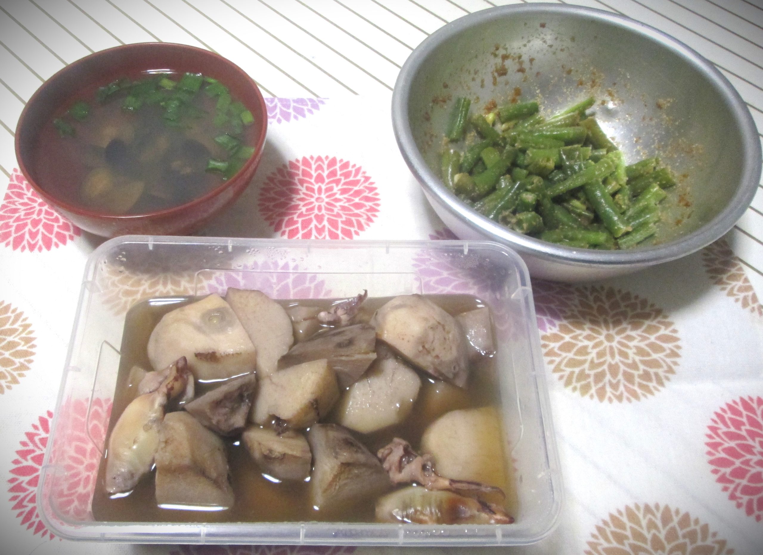 中は見切り品水イカ(199円/半額)と里芋(129円/半額)を使った煮物です。
