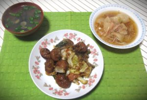 中は実家で貰った冷凍の黒酢鶏肉団子炒めです。ミックス野菜(98円)に残っていたもやしと冷凍刻みオクラも入れてます。にんにくを入れてます。