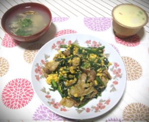 In the centre is niku-nira-tama, a stir-fry of pork, garlic chives, and egg.