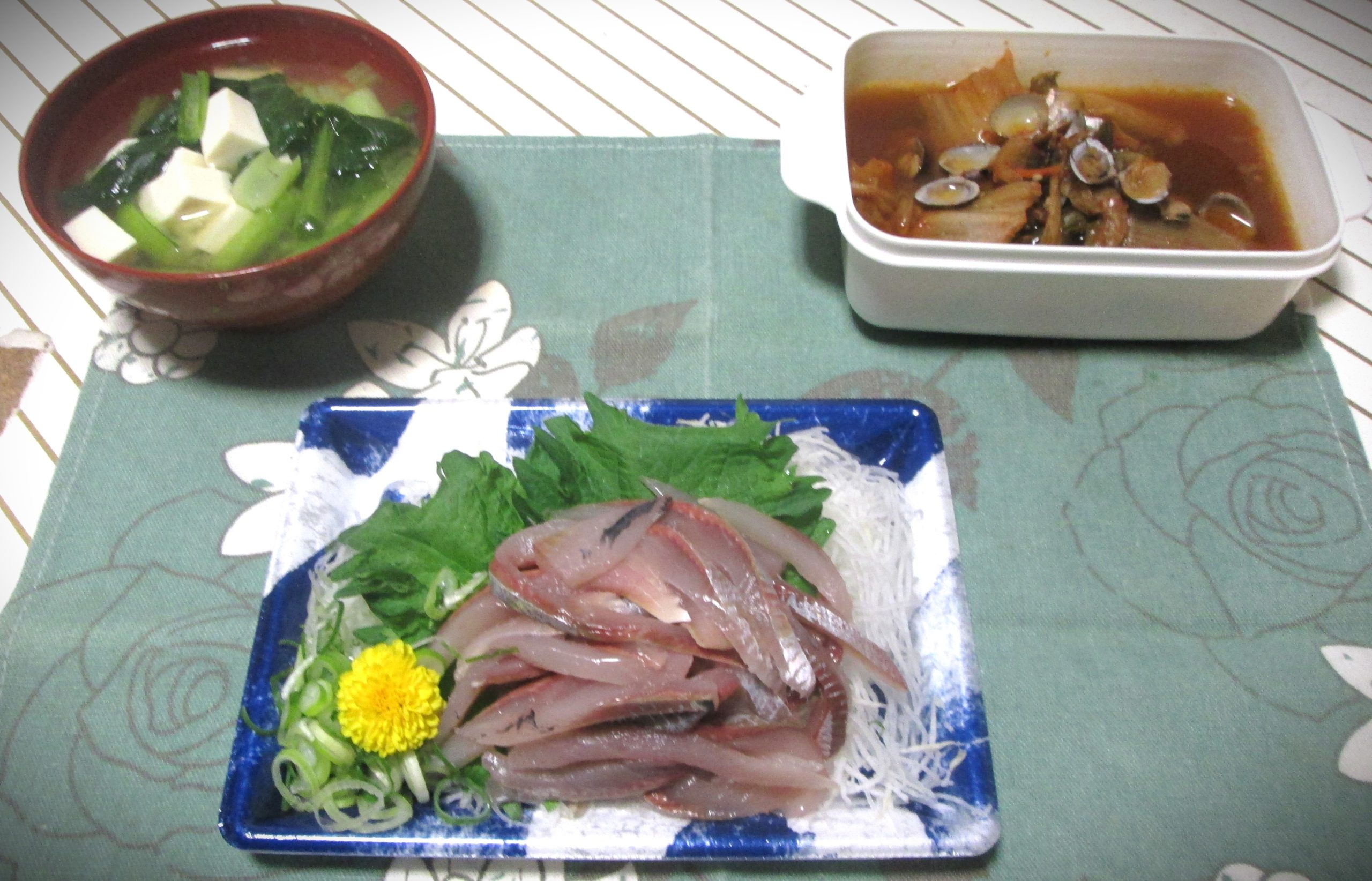 右は昨日の残りで、キムチ・白ネギ・しじみ・太刀魚を使ったキムチ煮です。圧力鍋で炊いているので太刀魚に多い小骨まで食べられます。