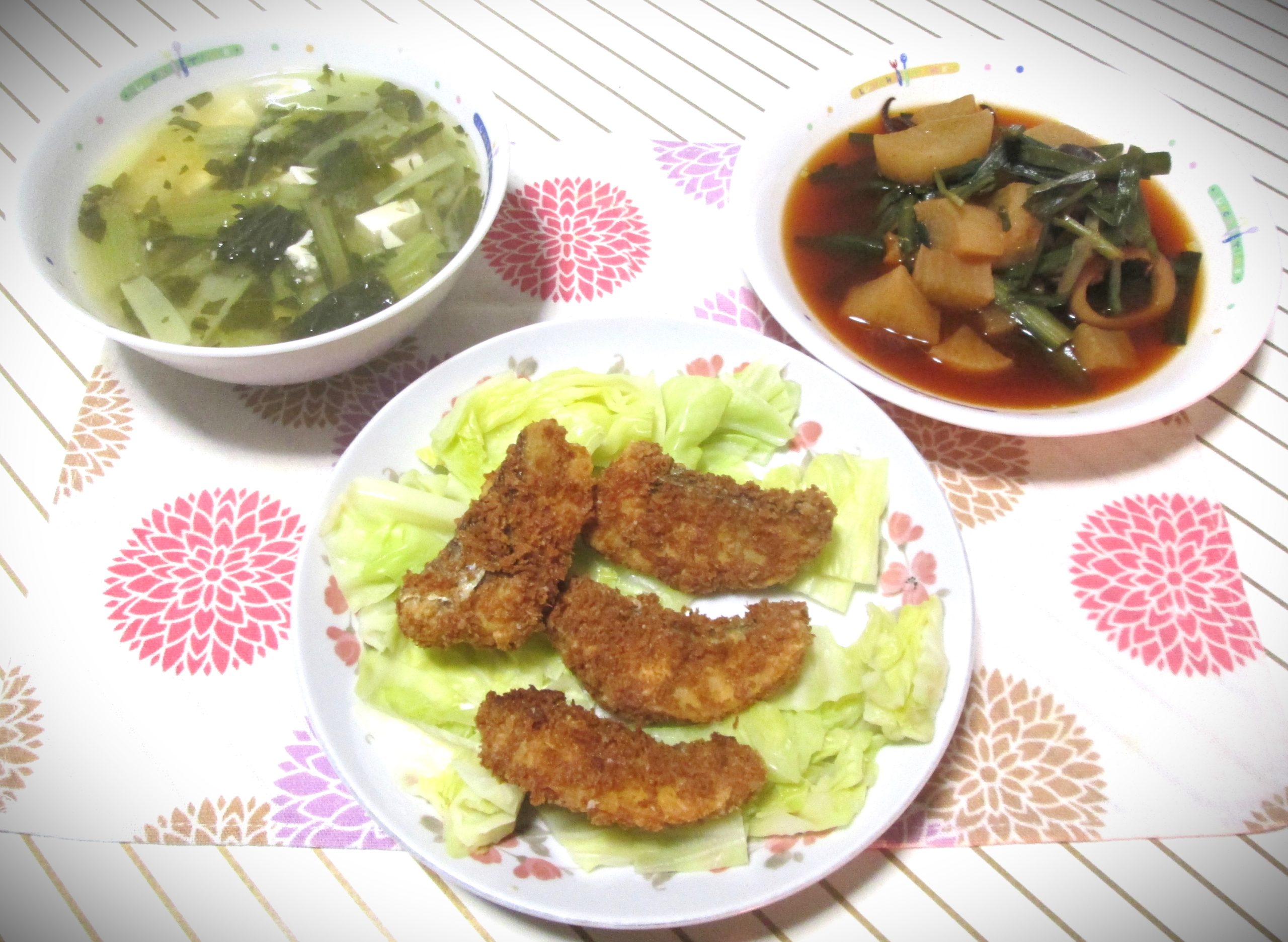 Today’s dinner is a home-style meal that combines leftovers, spicy simmered dishes, and fried fish.